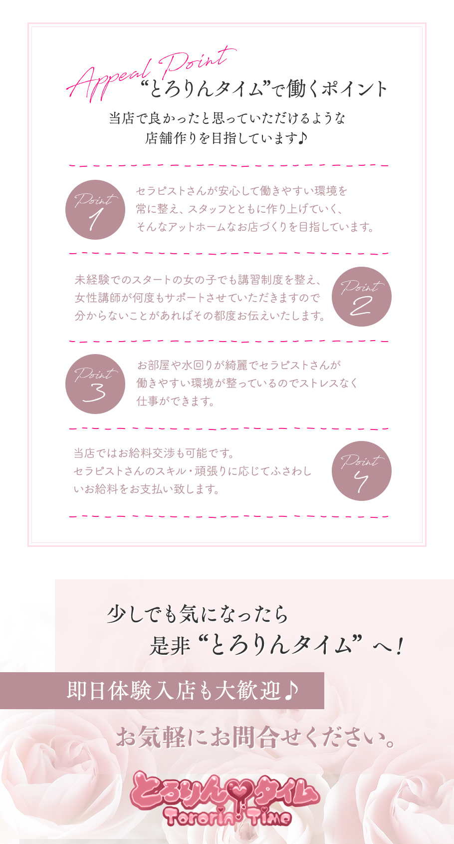 セラピストさんのスキル・頑張りに応じてふさわしいお給料をお支払い致します。